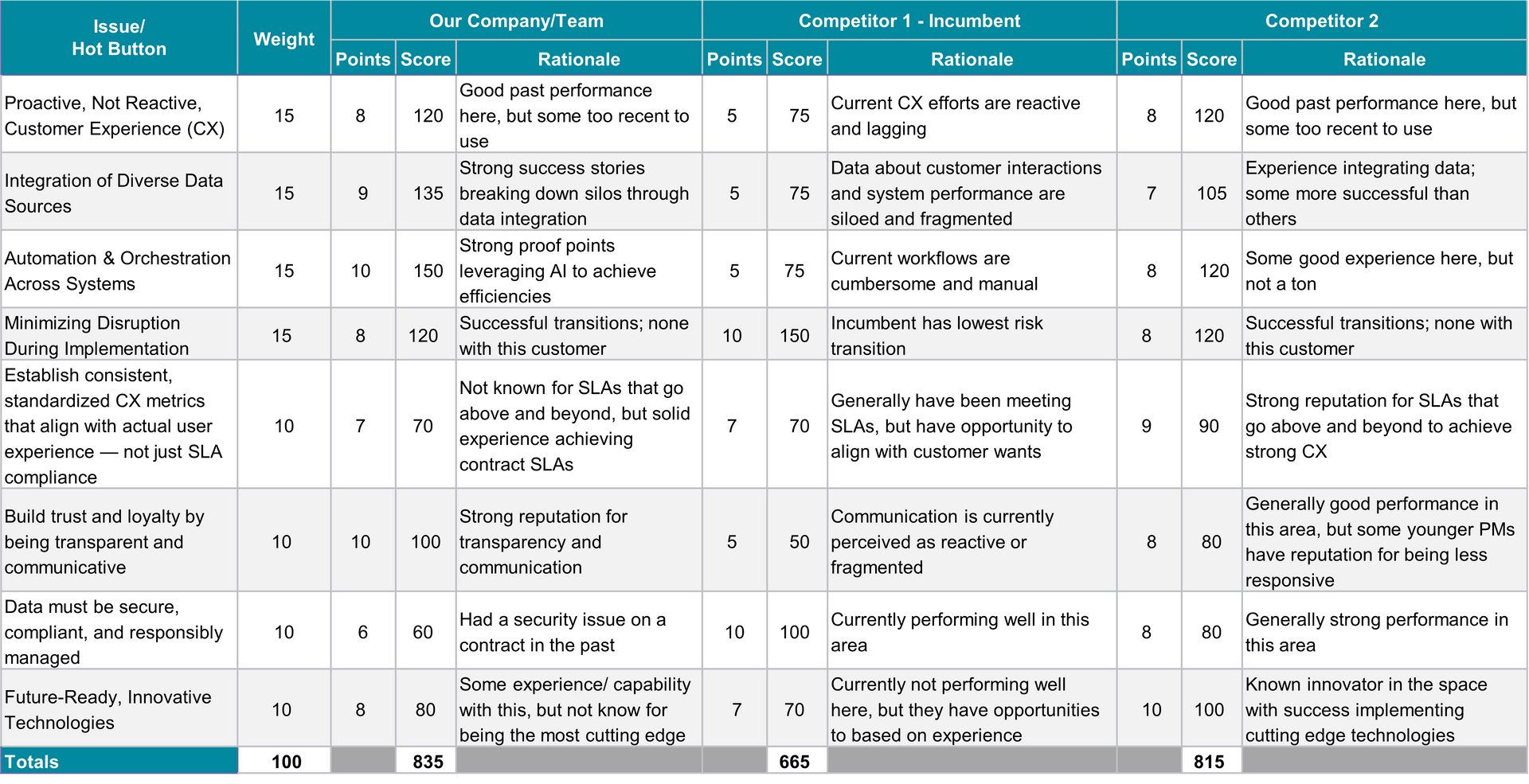Once you complete the competitive analysis, you can use the scores and notes to identify strengths, weaknesses, and differentiators for you and your competition. The issues/hot buttons with the lowest scores are the weaknesses, the ones with the highest scores are the strengths. Those areas where your team scores a strength and the competition has a weakness becomes a potential differentiator if your solution includes something that your competitors cannot claim. Looking at the example above, we can note that the incumbent’s poor performance is driving much of the future solicitation. Our company is slightly better positioned to win than Competitor 2, but it would not take much for them to strengthen their score to be better positioned than us. Our team has a noted strength and potential discriminator in automation and orchestration across systems, performing better than our competition with strong proof points leveraging custom suite of AI tools to achieve efficiencies. We also have a noted weakness in security that we will need to mitigate through teaming and in our technical approach.